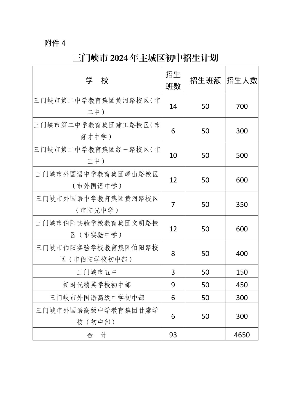 4.三门峡市2025年主城区初中招生计划