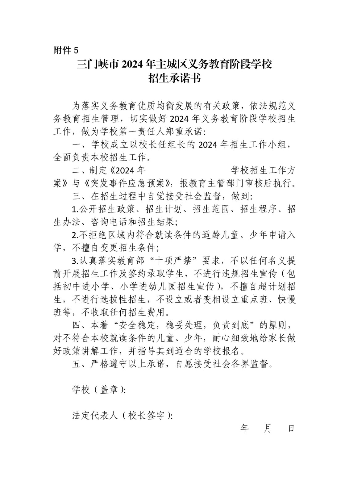 5.三门峡市2025年主城区义务教育阶段学校招生承诺书